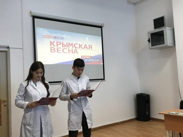 17 марта для студентов нашего Колледжа преподавателем истории был проведен урок в честь воссоединения Крыма, Севастополя и России в рамках Всероссийского урока «Крымская весна. Мы вместе!». Данный урок посвящён теме воссоединения полуострова с Россией, а также удивительной истории, разнообразной культуре и богатой природе этих земель. Ежегодно 18 марта, начиная с весны 2015-го, по всей стране отмечается День воссоединения Крыма с Россией, а у самих крымчан этот праздник даже считается выходным днем. Именно 18 марта 2014 года территория Республики Крым и город Севастополь, ранее принадлежащие Украине, официально вошли в состав Российской Федерации и стали ее новыми субъектами.