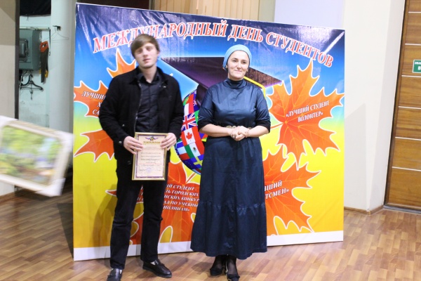 награждает Дипломом Кадиева Абдула – председателя студенческого Совета Колледжа,