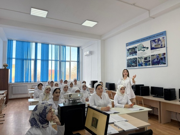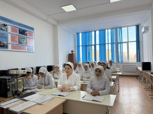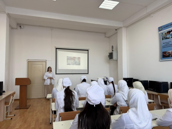 20.11.2025г.в ПОАНО "Медицинский колледж "г.Хасавюрт преподаватель Бугдаева Азиза Тимуровна провела открытый урок, посвящённый героической профессии военного и службе Отечеству.