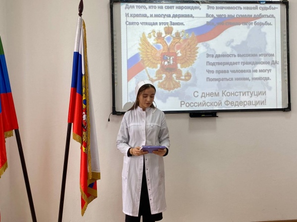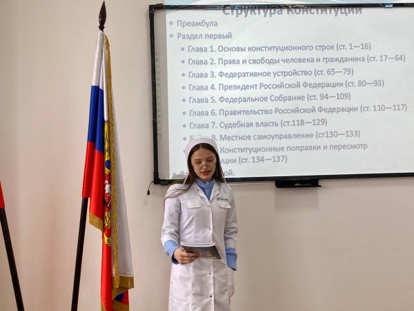 11 декабря в ПОАНО Медицинский колледж был проведен открытый классный час 1-го курса отделения «Сестринское дело», посвященный «Дню Конституции Российской Федерации».