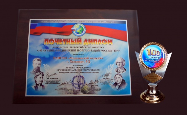 НАНОПО «Медицинский колледж» г. Хасавюрт Республики Дагестан награжден Почетным Дипломом победителя Всероссийского конкурса «100 лучших предприятий и организаций России -2016» в номинации Лучшее учреждение профессионального образования.