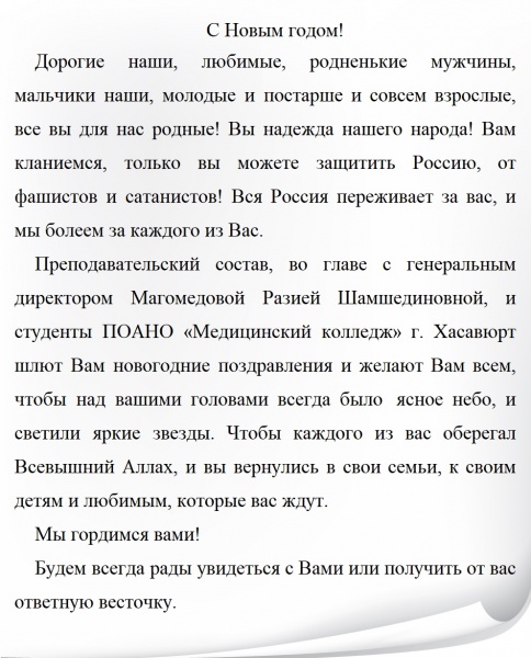 В первые праздничные дни января коллектив ПОАНО Медицинский колледж города Хасавюрт отправил через Общественную палату Республики Дагестан очередную партию благотворительной помощи защитникам Отечества.