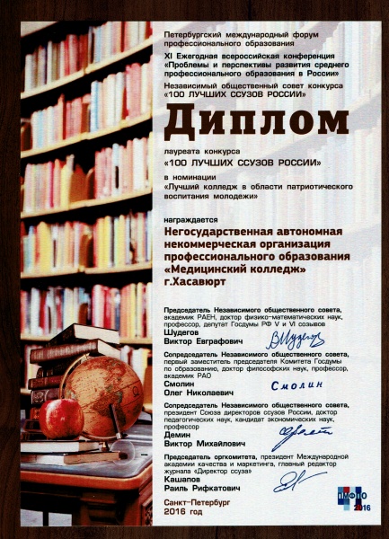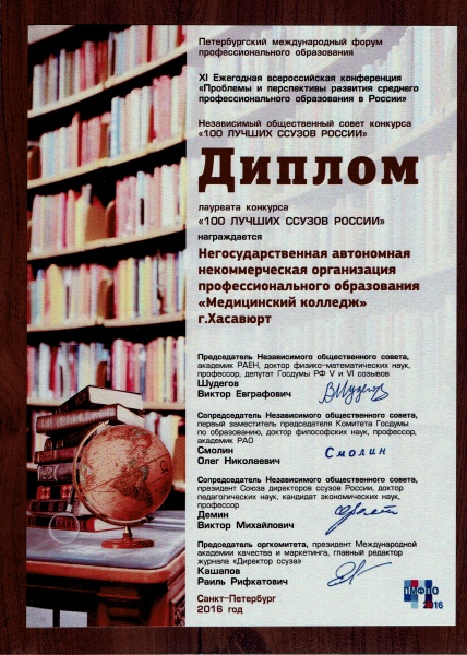 По проведенному мониторингу образовательного процесса Медицинскому колледжу г. Хасавюрта РД вручен Диплом лауреата конкурса и вручена золотая медаль "Европейское качество — 100 лучших ссузов России".