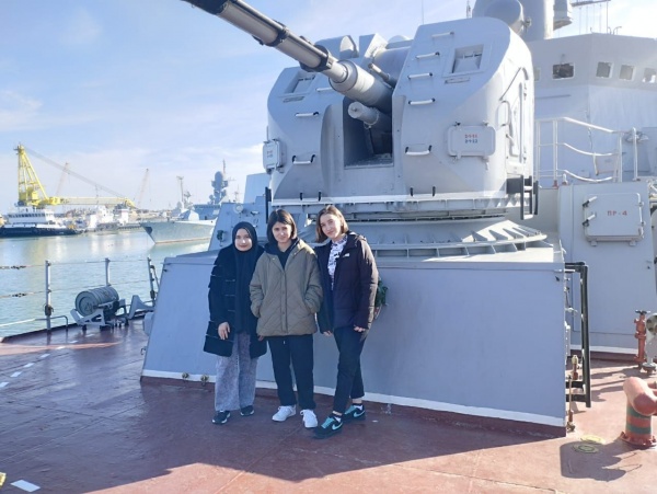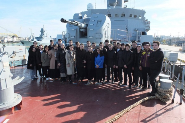 Молодежи рассказали о правилах поведения во время посещения судна и провели познавательную экскурсию по верхней палубе. Студентов познакомили с морской терминологией, особенностями жизни на корабле, назначением различных приборов и приспособлений. Также студенты узнали об истории флотилии, о боевом пути и участии в походах и контртеррористических операциях.