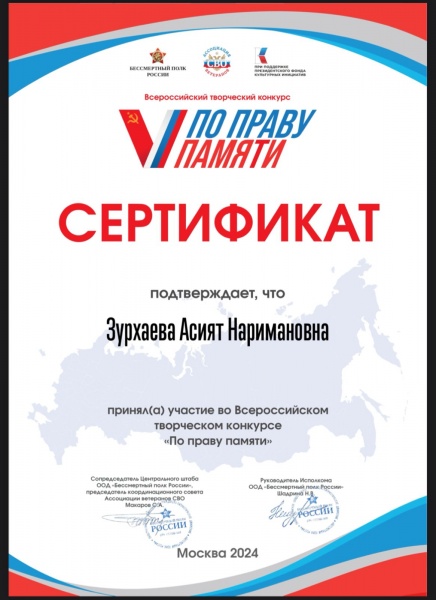 Зурхаеву Асият Наримановну – студентку 2 курса, отделения Лечебное дело с награждением Сертификатом участника Всероссийского творческого конкурса “По праву памяти”,