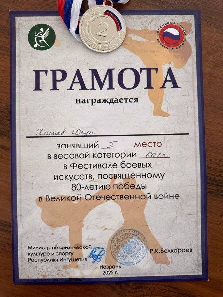Студент 2курса отделения Лечебное дело ПОАНО "Медицинский колледж" г. Хасавюрт принял участие а фестивале боевых искусств, посвящённом 80-летию победы в Великой Отечественной войне и занял 2место.