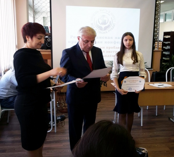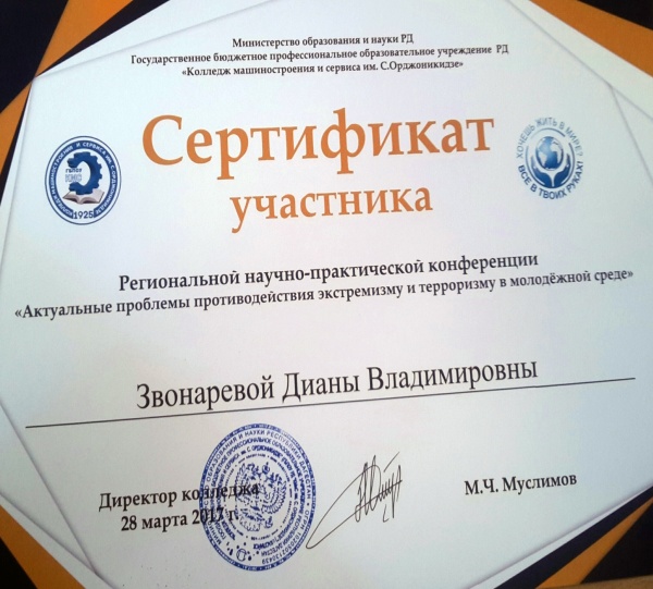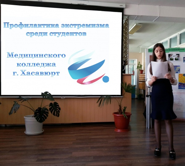В работе конференции приняли участие студентка Медицинского колледжа г.Хасавюрта Звонарева Диана и преподаватель Информатики Джаруллаева Джамиля Абдурагимовна. Звонарева Д. выступила с докладом на тему «Причины, условия и пути предотвращения возникновения экстремизма».