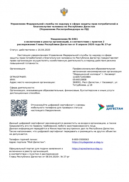Статус: действителен с 16.04.2020 Настоящим уведомлением Управление Федеральной службы по надзору в сфере защиты прав потребителей и благополучия человека по Республике Дагестан предоставляет право организации осуществлять хозяйственную деятельность в период действия режима повышенной готовности.