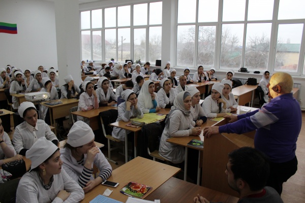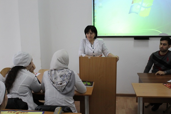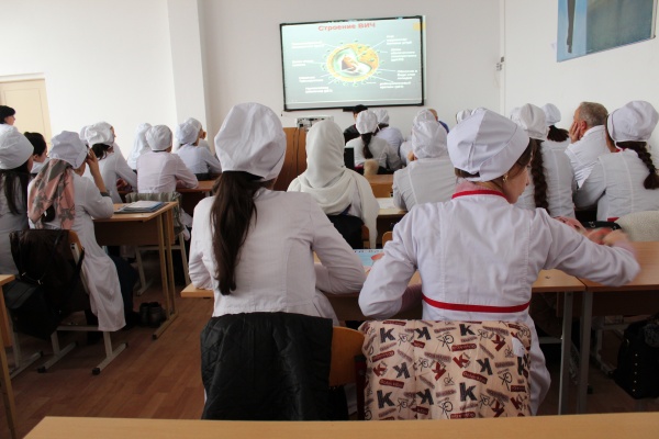 Врачи с больницы, Османов Ибрагим Камилевич – ответственный по спиду ЦГБ г. Хасавюрт и Канбулатов Гаджи Абидович показали студентам информационный фильм по проблеме СПИДа, обсудил возникшие вопросы и провел анкетирование среди студентов на выявление уровня информированности населения о ВИЧ-инфекции.