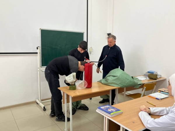 Приглашенные гости: Гасанов Муса ведущий специалист и Абакаров Султангерей начальник отдела оперативного планирования, детально рассказали о культуре безопасности жизнедеятельности, эффективное усвоение теоретических знаний поведения при ЧС, практически показали как обращаться с огнетушителями, на примерах рассказали о престиже профессий пожарного и спасателя.