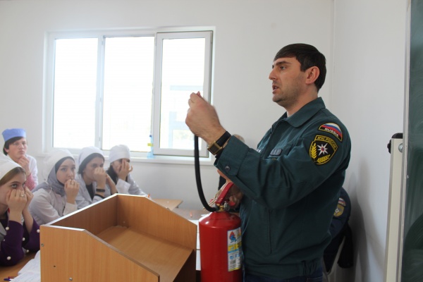 На днях в нашем Колледже состоялась встреча студентов с работниками городского управления МЧС. Ведущие специалисты управления МЧС г. Хасавюрт Гасанов Муса Жабраилович и Патичев Альберт Исматулаевич ознакомили студентов с правилами поведения при угрозе возникновения ЧС различного характера (пожар, землетрясение), а так же практически показали, как пользоваться первичными средствами пожаротушения (огнетушителем). Студентами были заданы вопросы, на которые были даны исчерпывающие ответы.
